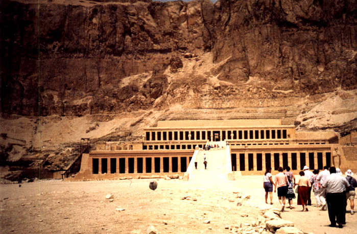 Doch nur kurz ist unser Aufenthalt hier, dann begeben wir uns zum Tal der Könige. In diesem Tal wurden fünfhundert Jahre lang die Pharaonen in reich ausgestatteten Gräbern beigesetzt. In diesem wasserlosen Gebiet sind bis jetzt 62 Gräber bekannt geworden, und von diesen können einige besichtigt werden. Am Eingang des Tales verlassen wir den Bus und gehen über den staubigen Weg zum Mittelpunkt dieser Anlage. Der steinige Boden strahlt die Hitze der Sonne wieder, es ist heiß und trocken. Die Gräber liegen auf dem Gelände verstreut, man sieht nur die betonierten Eingänge. Wir gehen zuerst zum Grab von Ramses VI. Die Luft ist zwar ziemlich stickig, doch die Wandbilder sind den Besuch wert. Sämtliche Wände und die Decke sind mit Bildern geschmückt, die Szenen aus dem Totenbuch und andere mythologische Begebenheiten zeigen. Besonders die in leuchtenden gelb und blau gehaltenen Malereien an der Decke fallen einem ins Auge. Top Natürlich gehe ich zum Grab von Tutenchamun. Es liegt unterhalb des Grabes von Ramses VI und ist wahrscheinlich deshalb erst 1922 entdeckt worden. Berühmt geworden ist es durch die Schätze, die man im Inneren gefunden hat. Grabräuber hatten zwar das Grab geöffnet, doch noch nichts entfernt. An den Ausstellungsstücken im Ägyptischen Museum sieht man mit welcher Pracht ein Pharao bestattet wurde. Dabei handelt es sich um das kleinste Grab hier, und man fragt sich, wo in aller Welt die ganzen Gegenstände Platz gefunden haben. Es handelt sich nur um einen kurzen Gang mit einer Haupt- und zwei Nebenkammern. Von einer Stufe aus kann ich in der Grabkammer den Sarkophag und den äußeren Sarg sehen, worin sich die Mumie des Pharaos befindet. Top |